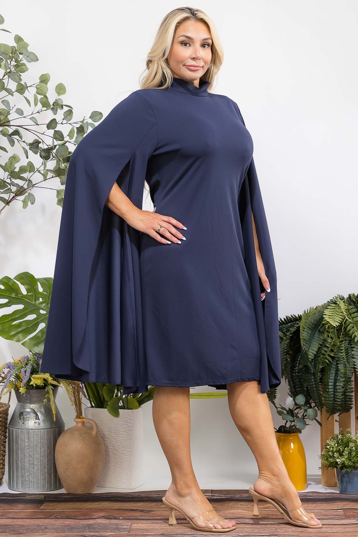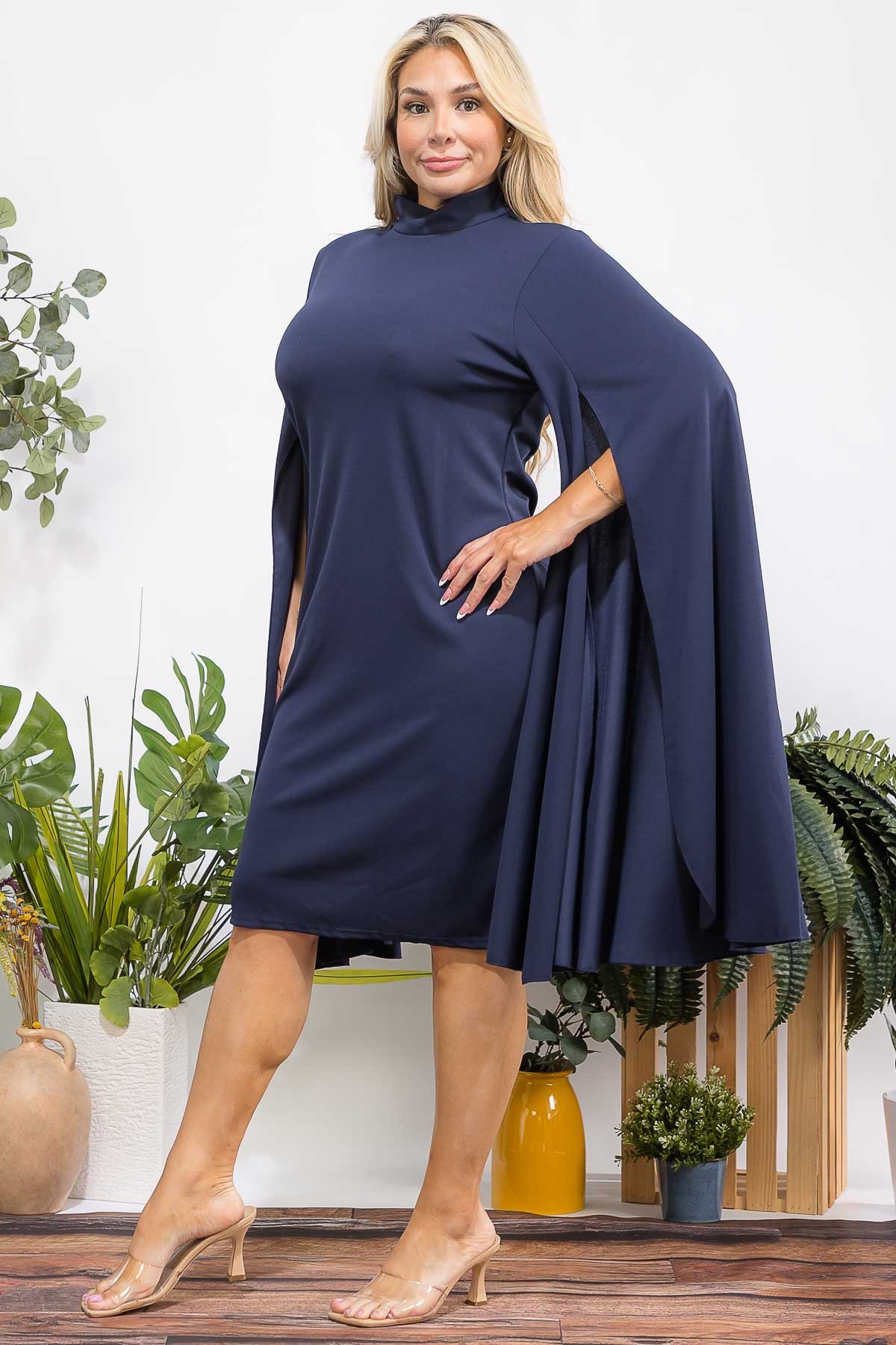 Midi dress. Designed to show off your silhouette, this dress has a bodycon fit, Hi neckline is balanced with a below the knee hemline, while the cape sleeves deliver a high impact yet sophisticated look.