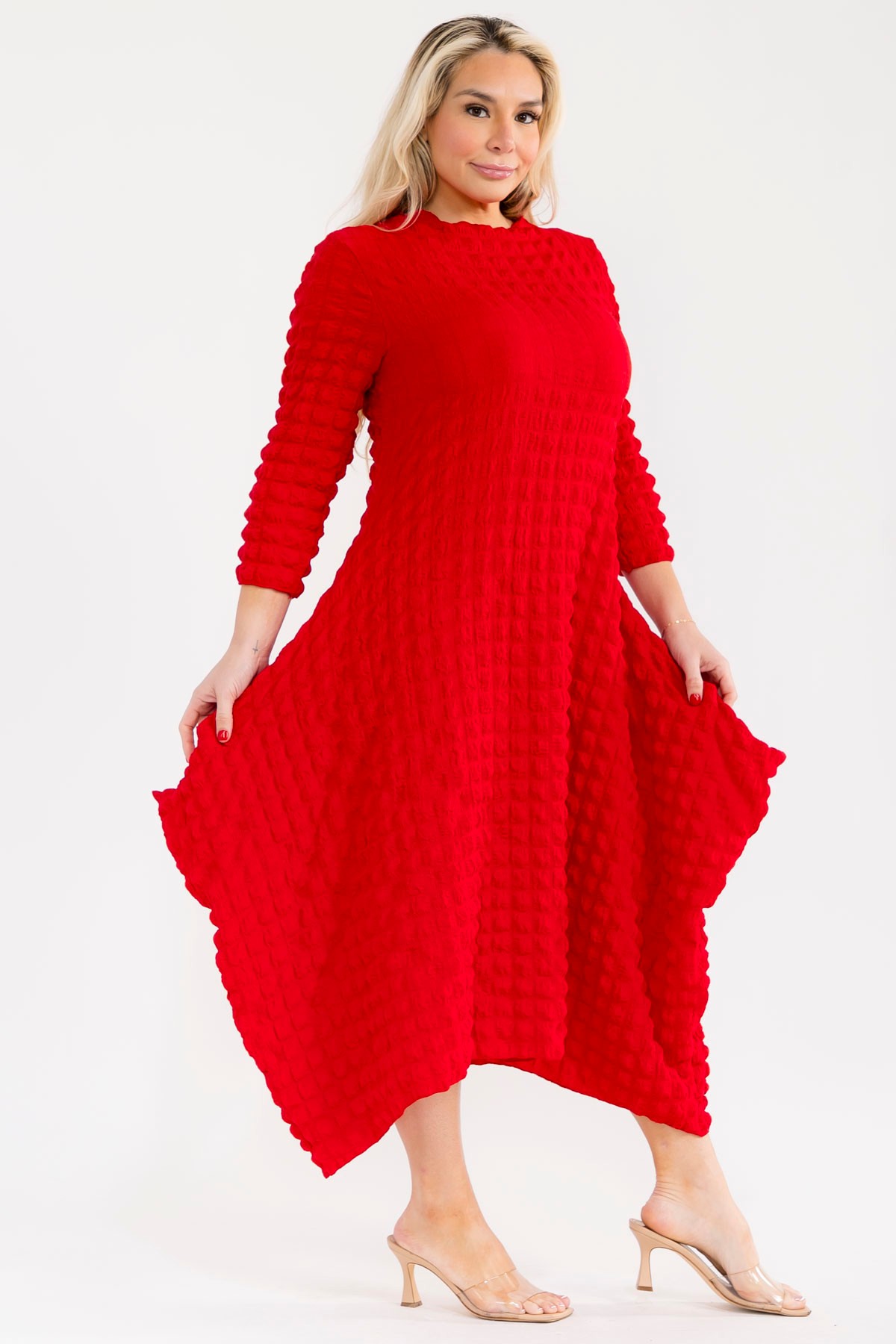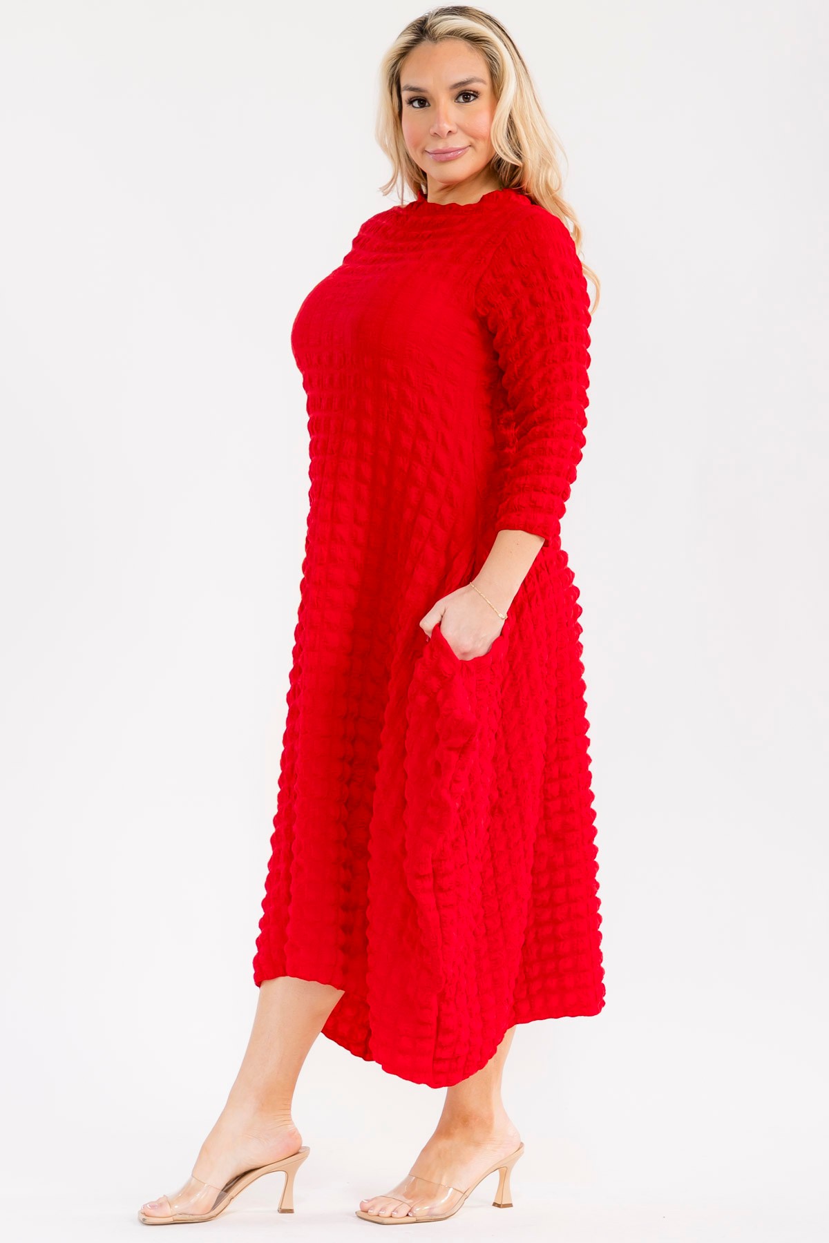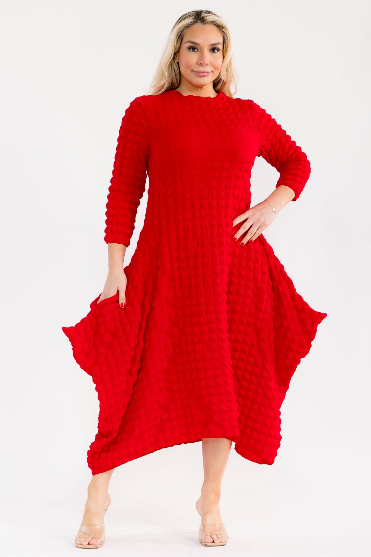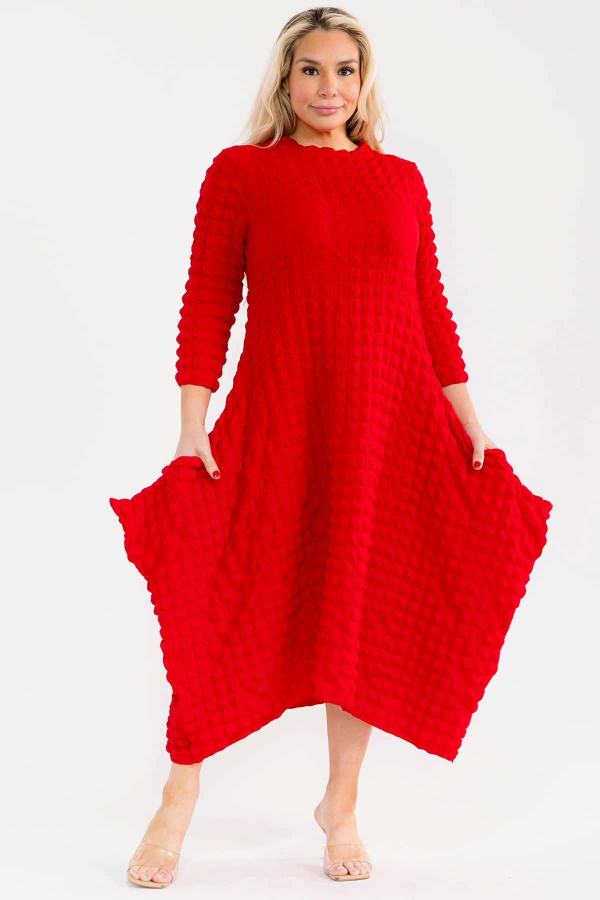 This vibrant Red dress is a true statement piece, perfect for any occasion. Crafted from a BUBBLE fabric, POCKETS, it offers both visual interest and a comfortable, breathable feel. The midi length and three-quarter sleeves provide a flattering silhouette, while the gently flared skirt adds a touch of playful movement. This dress effortlessly transitions from a casual daytime look to an elegant evening ensemble, making it a versatile addition to any wardrobe. A must-have for the modern woman.