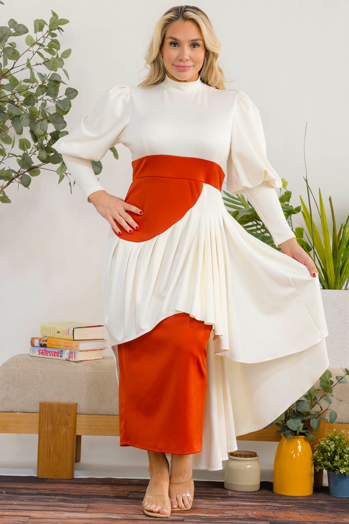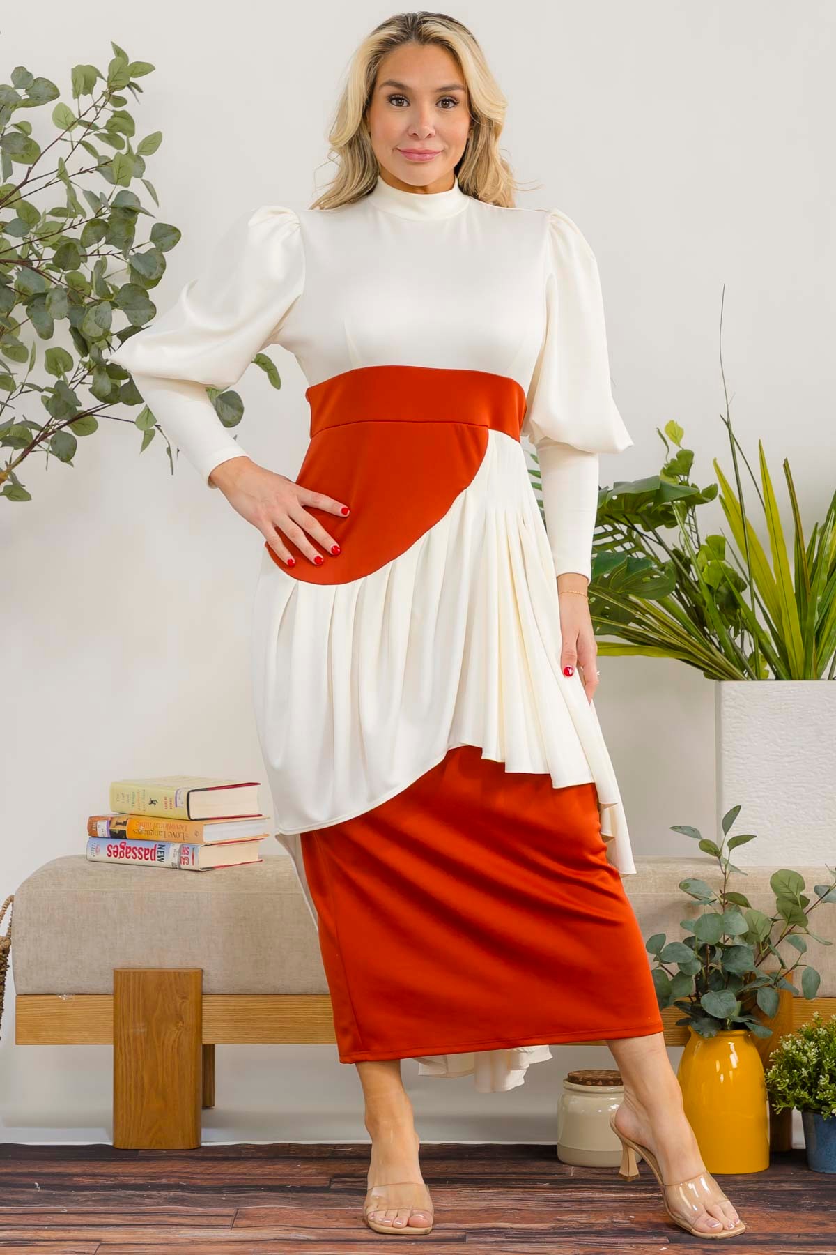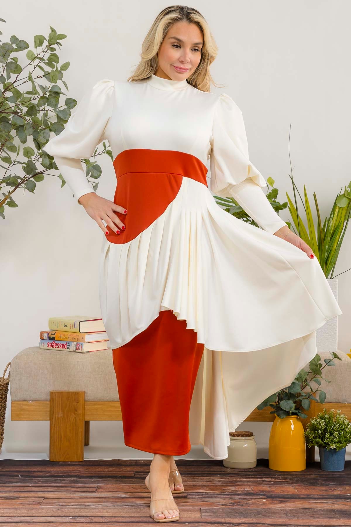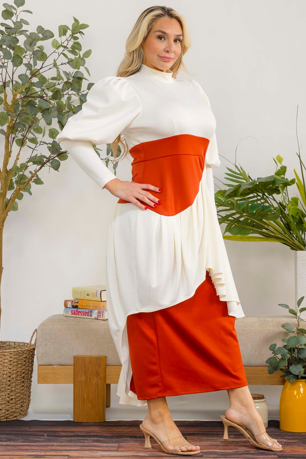 This dress is a two-tone, elegant midi dress with a modern layered design.