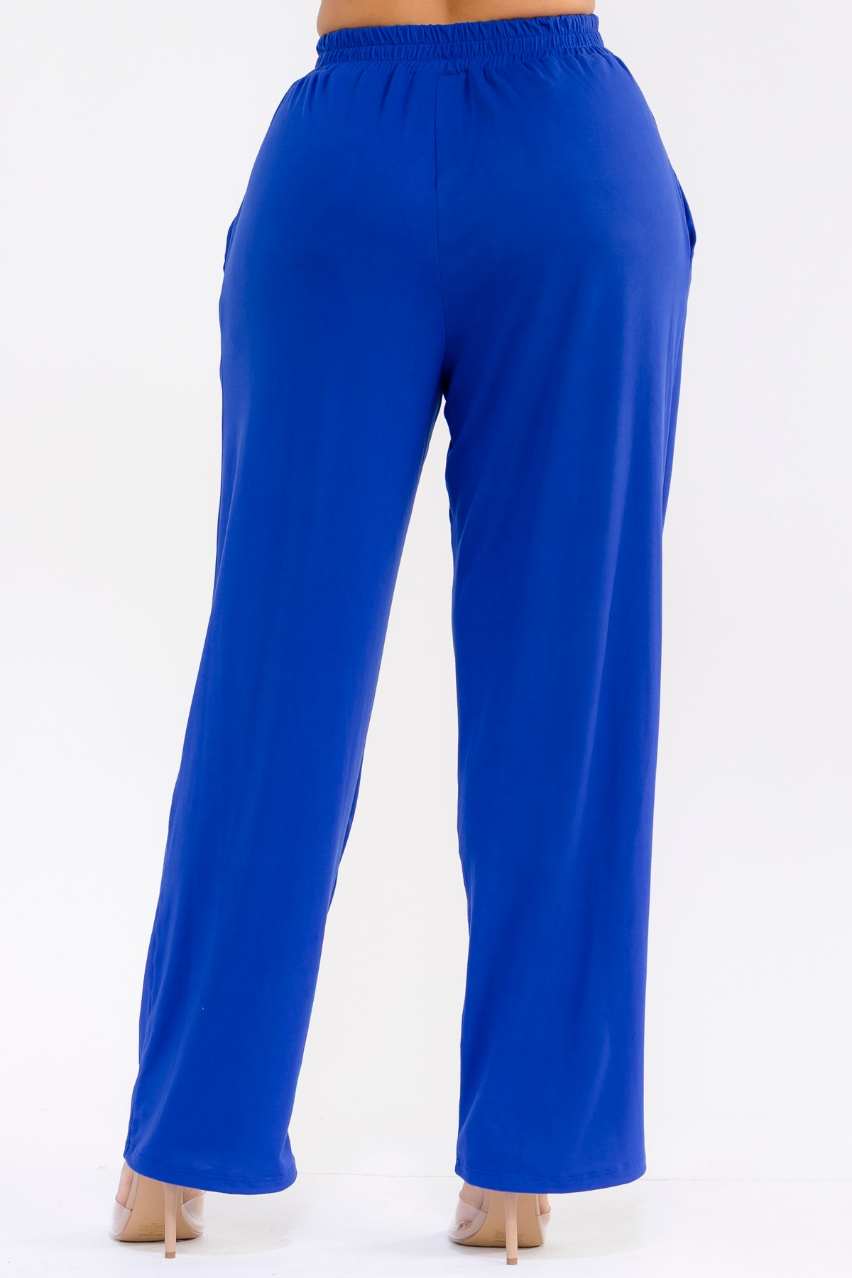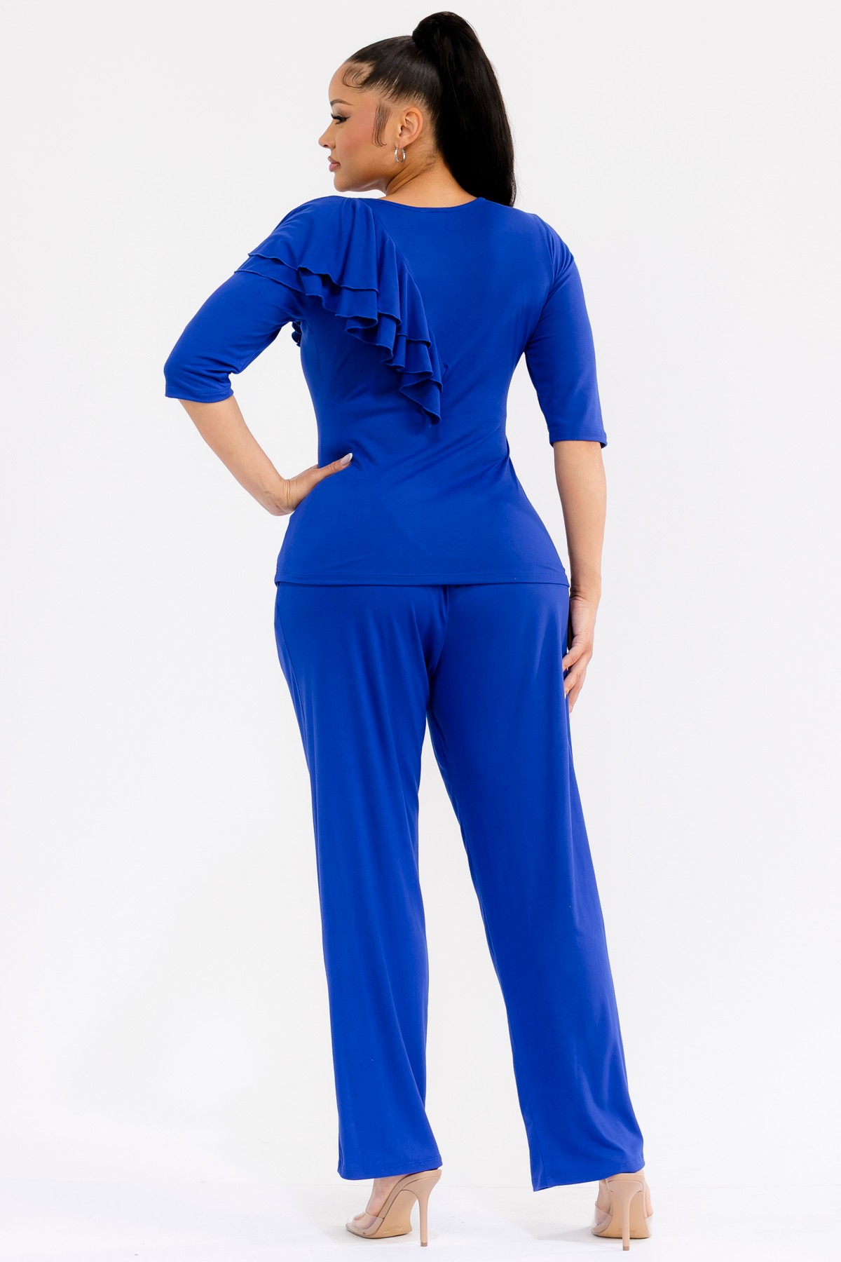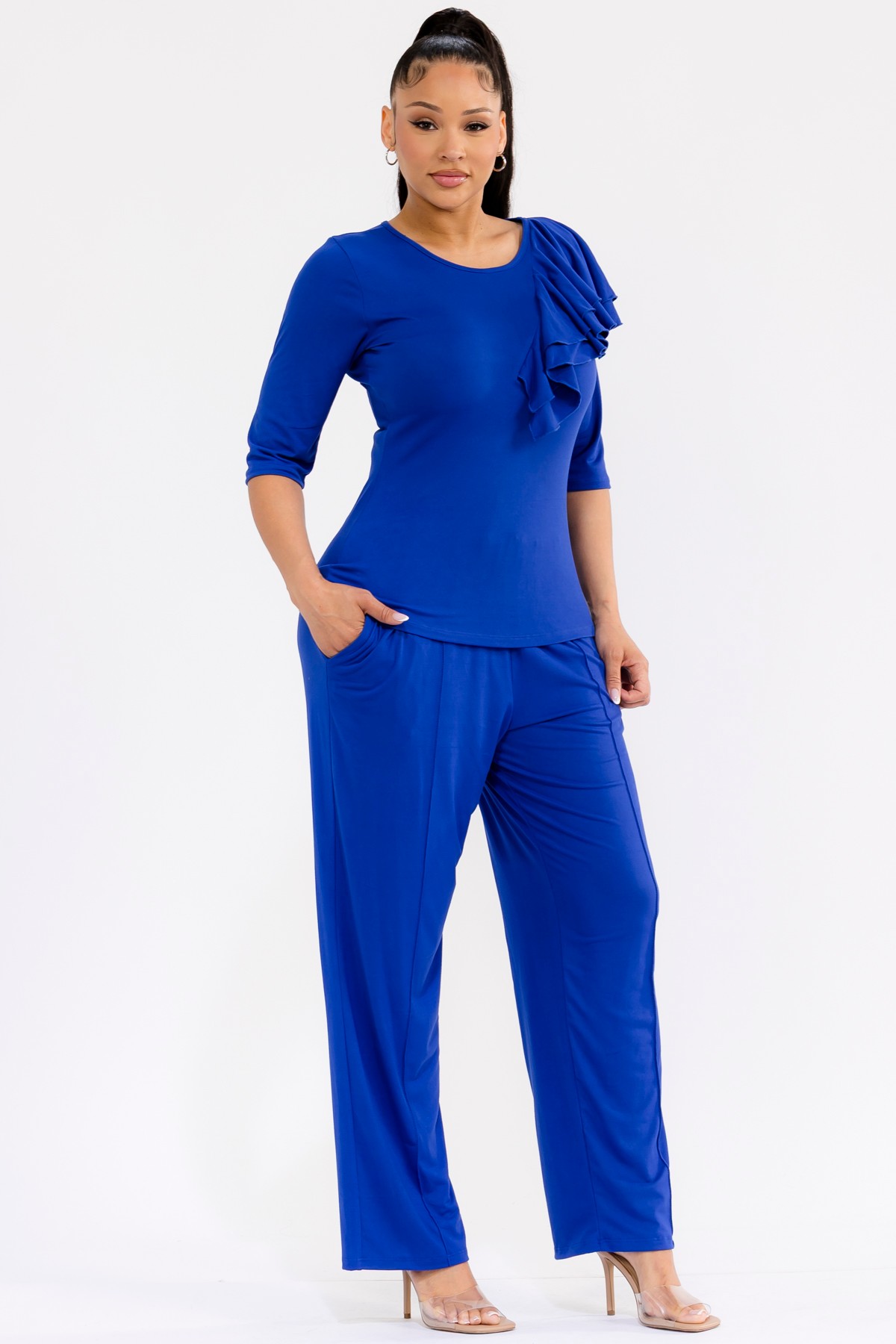 Royal blue pants set. The ensemble features a sophisticated top with delicate ruffles cascading across the shoulder, adding a touch of feminine flair. Crafted from a soft, breathable fabric, it offers exceptional comfort without compromising on style. The matching wide-leg pants are designed for a relaxed yet polished silhouette, complete with an elastic waistband for a perfect fit and convenient side pockets. It's an ideal choice for any woman seeking effortless elegance and comfort in her wardrobe, perfect for spring and summer seasons.