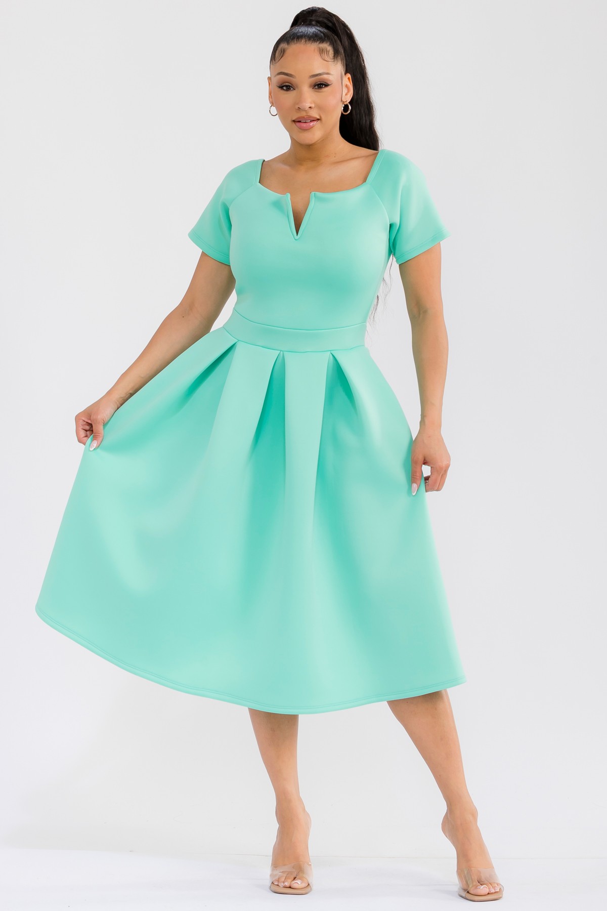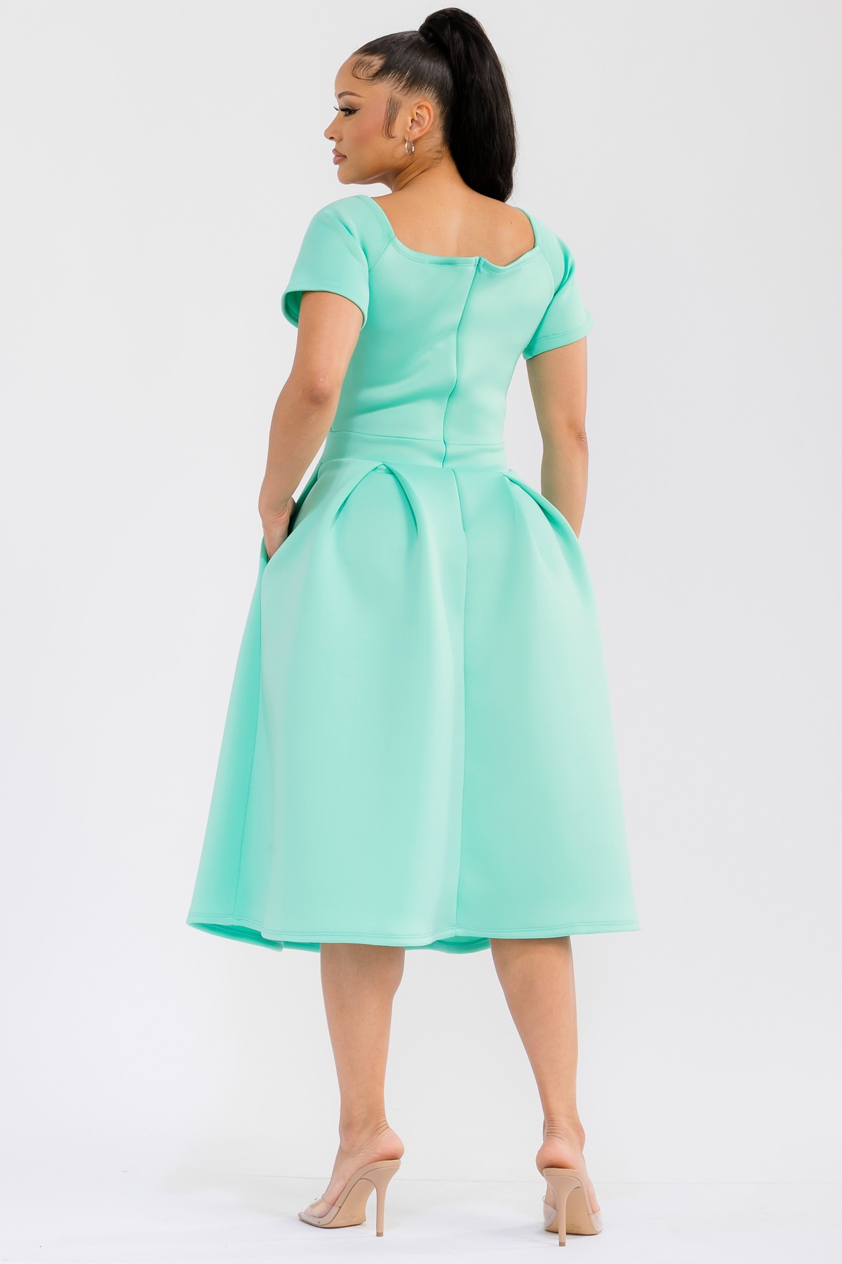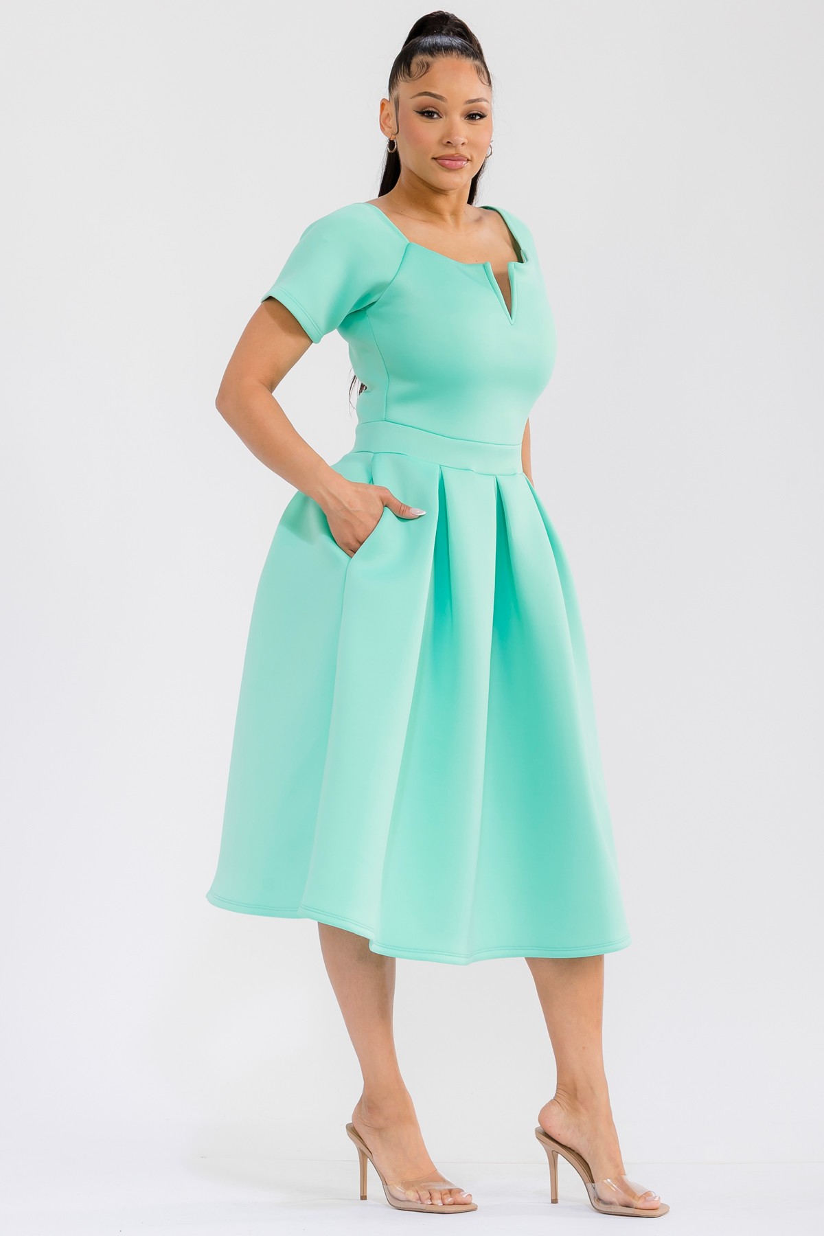 This exquisite midi dress is designed to make a statement. Featuring a sophisticated off-the-shoulder neckline with a chic V-notch detail, it elegantly frames the décolletage. The fitted bodice transitions seamlessly into a voluminous, pleated skirt that falls to a flattering midi length, creating a graceful silhouette. Practical and stylish, the dress boasts convenient side pockets, adding a touch of modern functionality. Ideal for cocktail parties, formal events, weddings, or even a stylish brunch, this dress exudes confidence and sophistication. Pair it with delicate jewelry and elegant heels to complete the ensemble. The thoughtful design ensures comfort without compromising on style, making it a go-to piece for any fashion-forward individual seeking a blend of classic elegance and contemporary flair. Its flattering cut and rich color are sure to turn heads and make you feel fabulous.