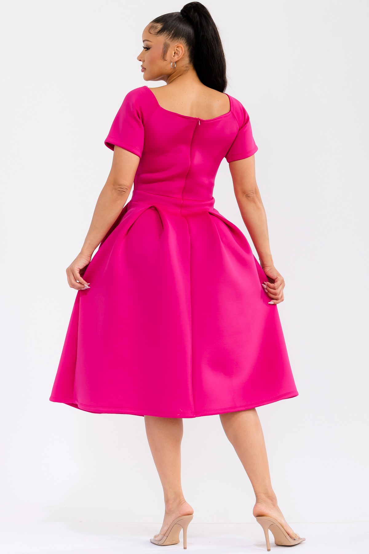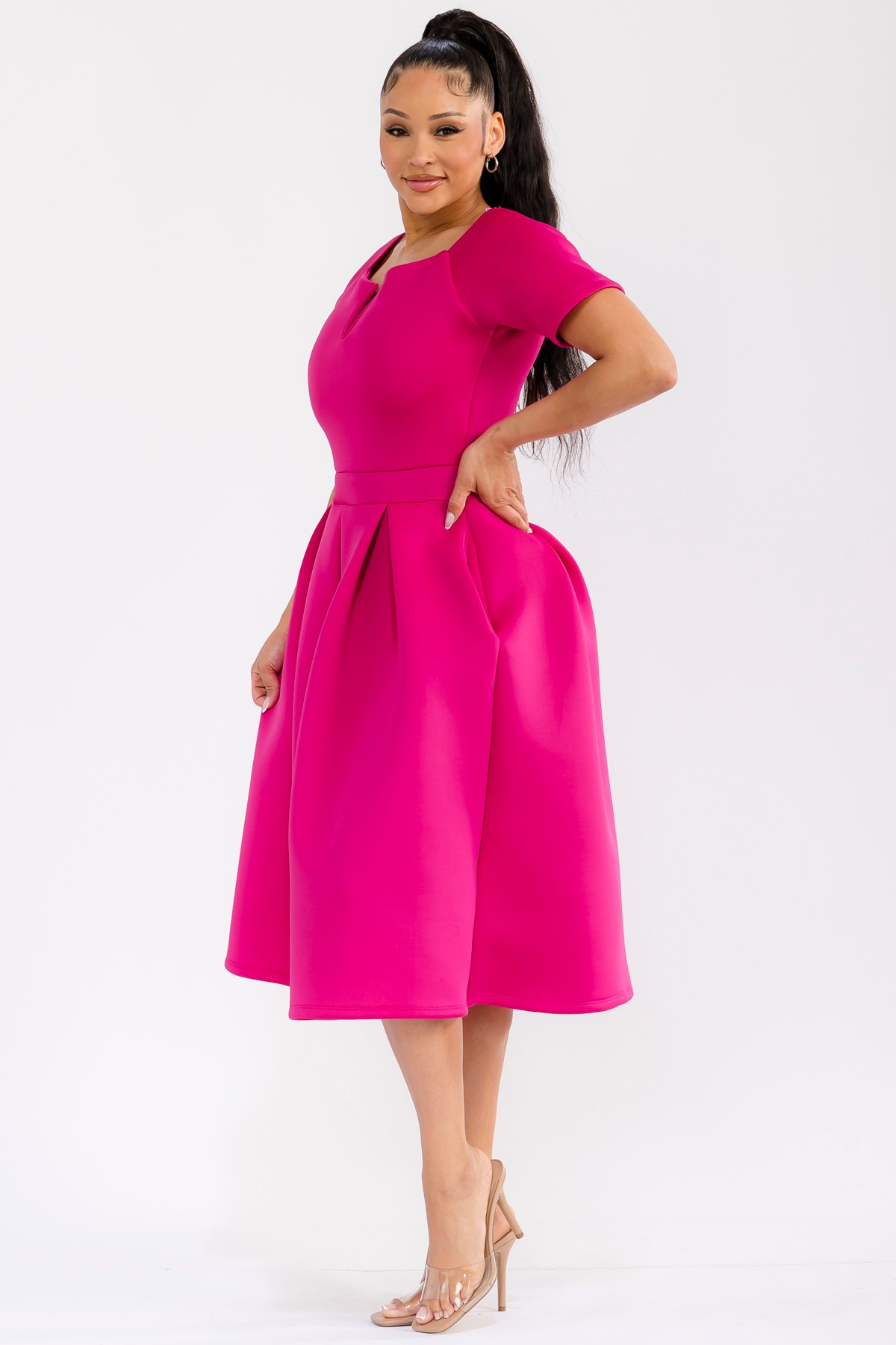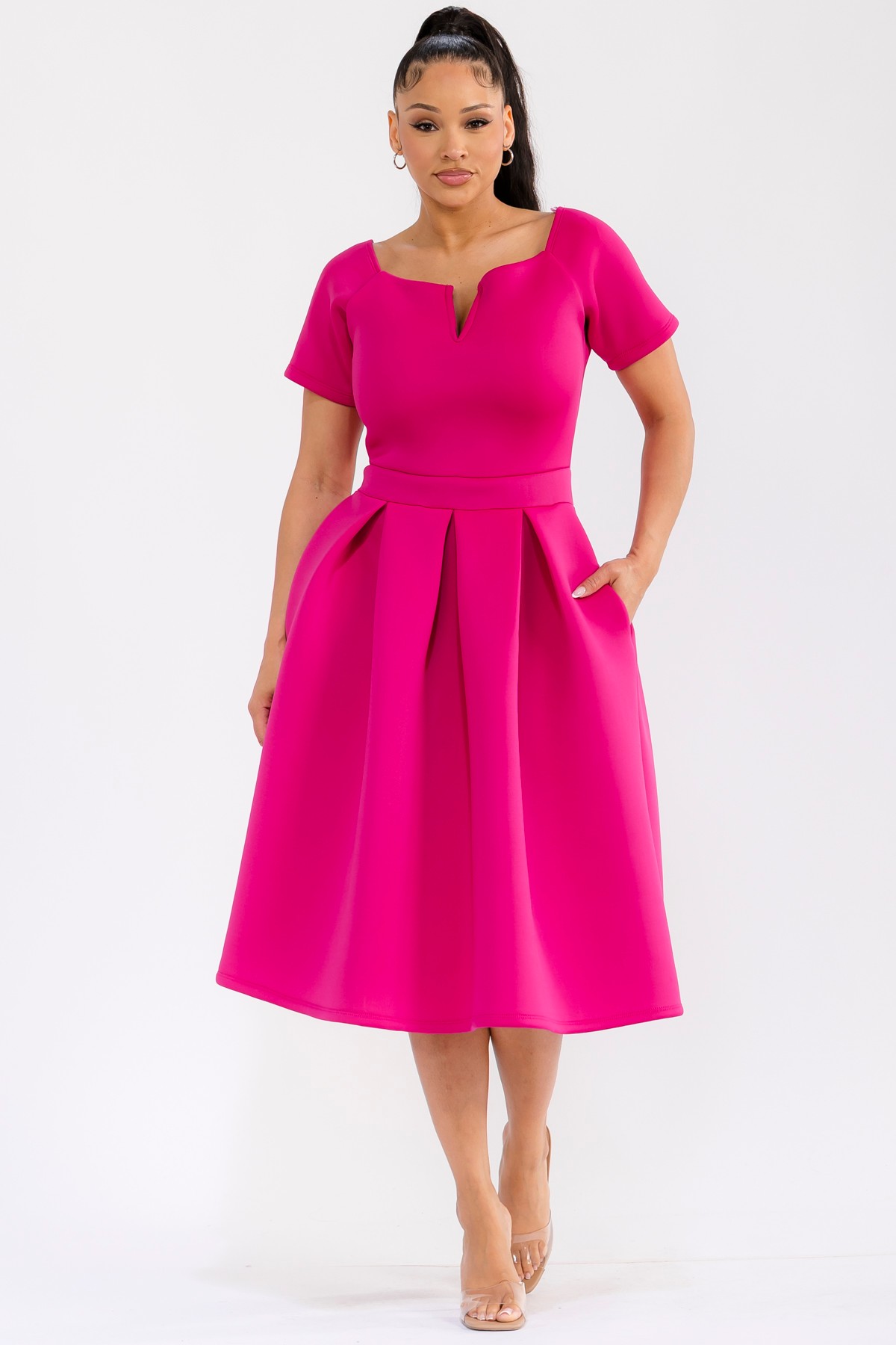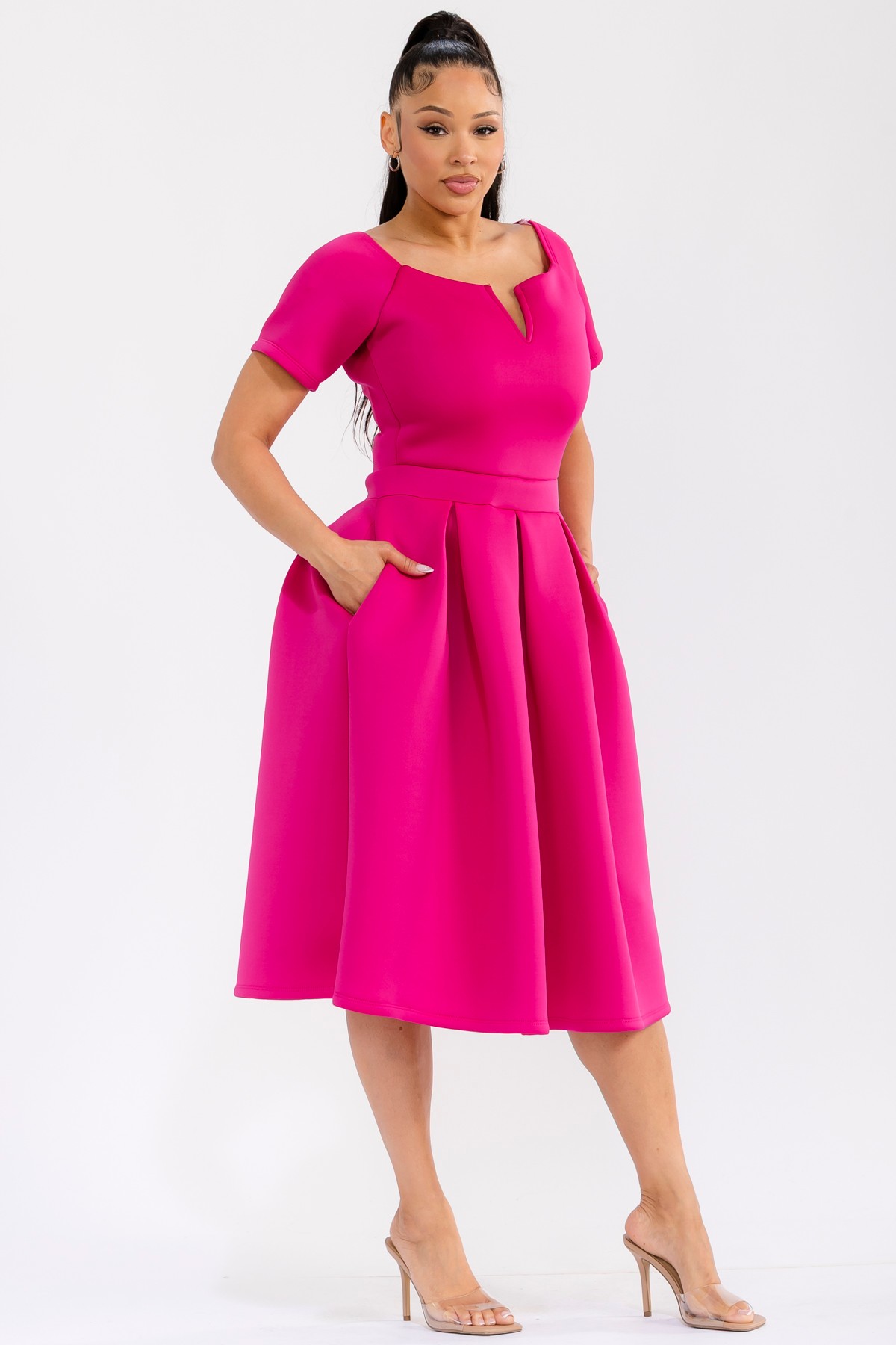 This exquisite midi dress is designed to make a statement. Featuring a sophisticated off-the-shoulder neckline with a chic V-notch detail, it elegantly frames the décolletage. The fitted bodice transitions seamlessly into a voluminous, pleated skirt that falls to a flattering midi length, creating a graceful silhouette. Practical and stylish, the dress boasts convenient side pockets, adding a touch of modern functionality. Ideal for cocktail parties, formal events, weddings, or even a stylish brunch, this dress exudes confidence and sophistication. Pair it with delicate jewelry and elegant heels to complete the ensemble. The thoughtful design ensures comfort without compromising on style, making it a go-to piece for any fashion-forward individual seeking a blend of classic elegance and contemporary flair. Its flattering cut and rich color are sure to turn heads and make you feel fabulous.