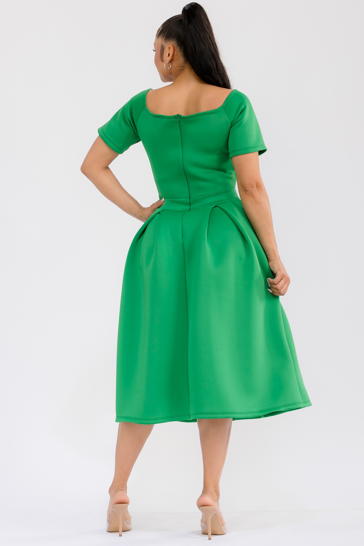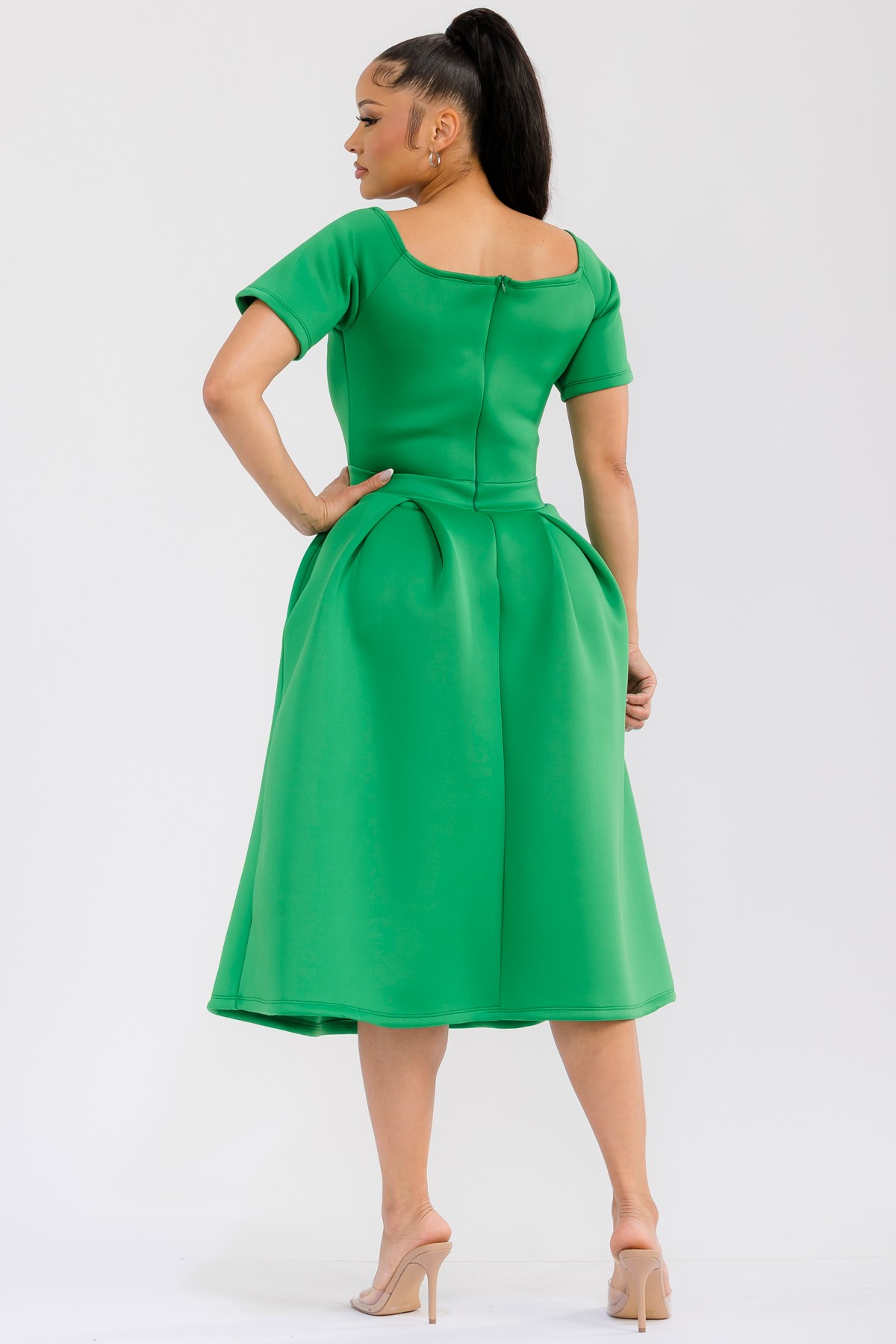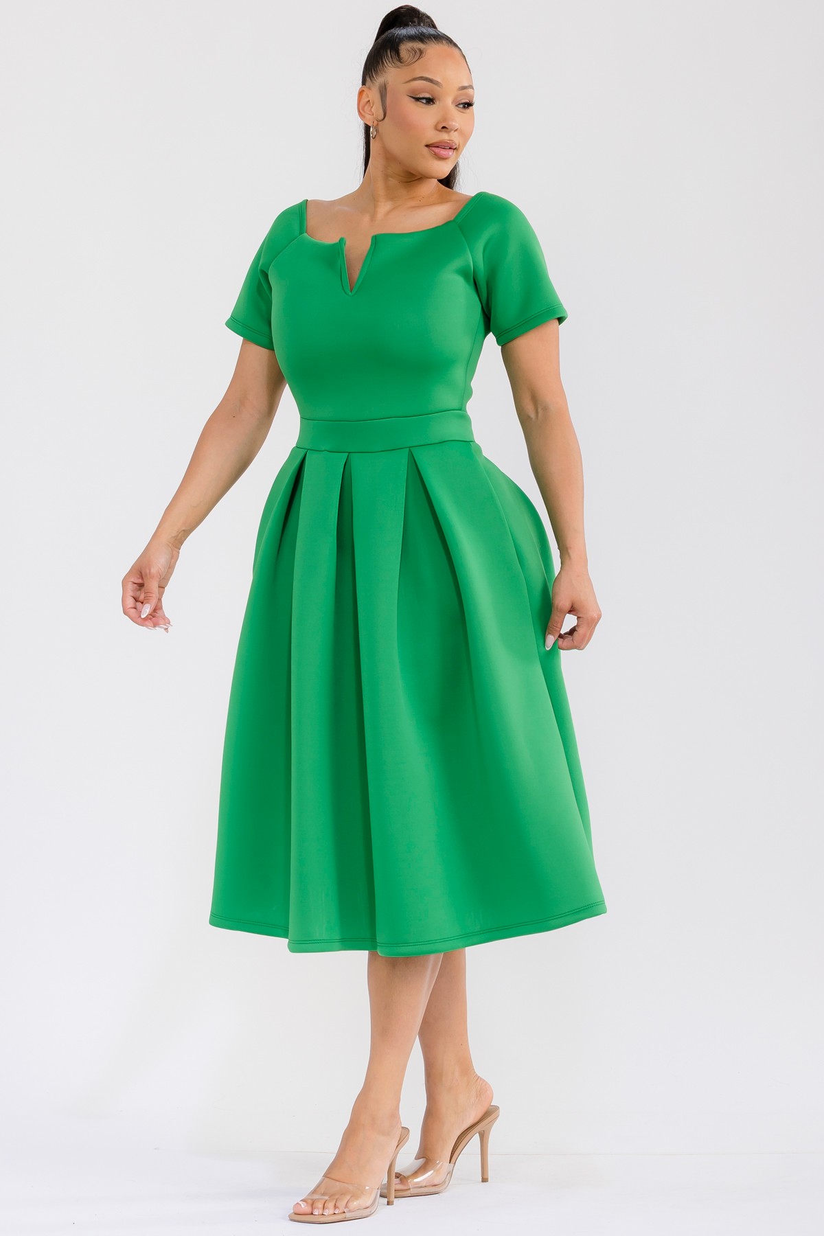 This exquisite midi dress is designed to make a statement. Featuring a sophisticated off-the-shoulder neckline with a chic V-notch detail, it elegantly frames the décolletage. The fitted bodice transitions seamlessly into a voluminous, pleated skirt that falls to a flattering midi length, creating a graceful silhouette. Practical and stylish, the dress boasts convenient side pockets, adding a touch of modern functionality. Ideal for cocktail parties, formal events, weddings, or even a stylish brunch, this dress exudes confidence and sophistication. Pair it with delicate jewelry and elegant heels to complete the ensemble. The thoughtful design ensures comfort without compromising on style, making it a go-to piece for any fashion-forward individual seeking a blend of classic elegance and contemporary flair. Its flattering cut and rich color are sure to turn heads and make you feel fabulous.