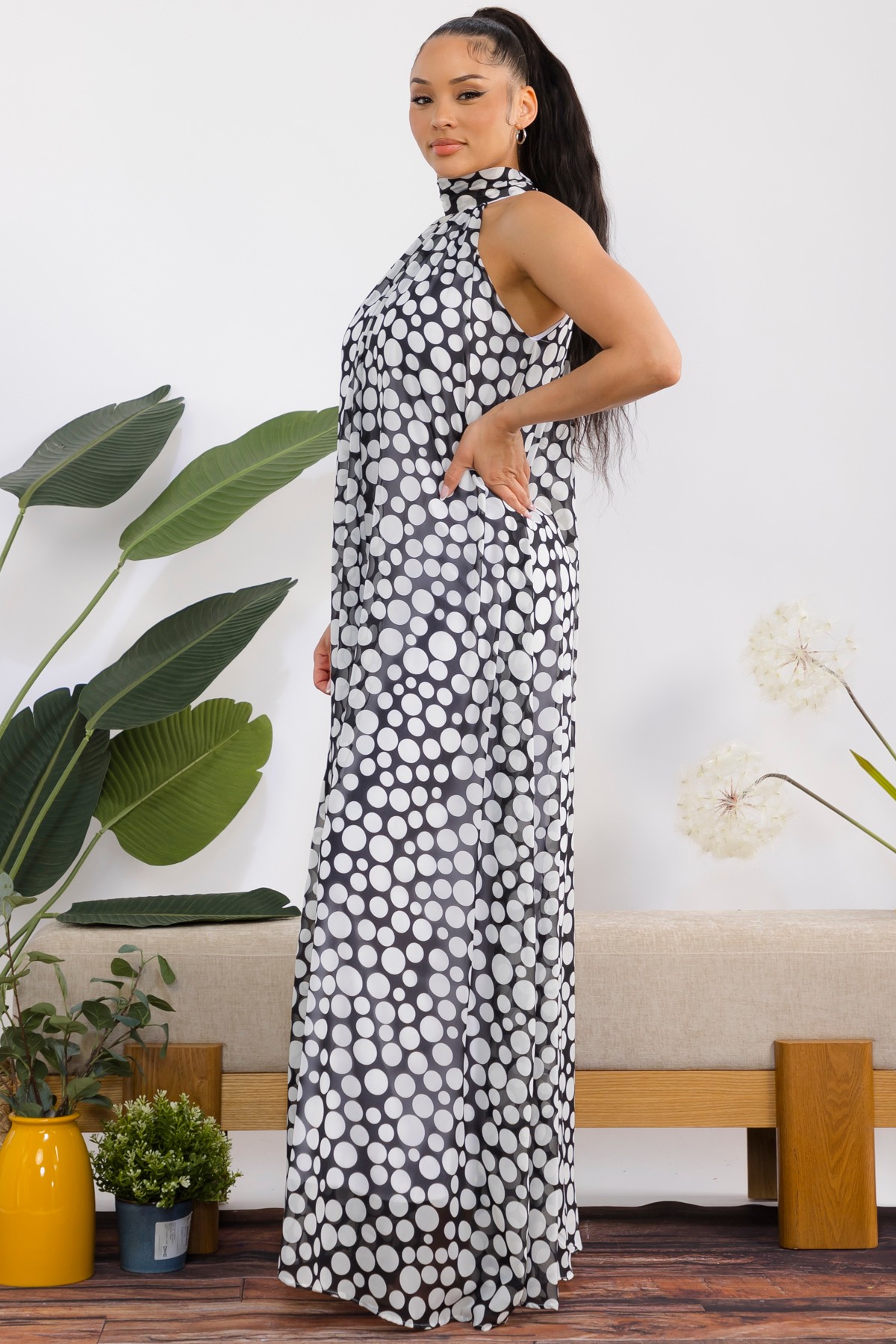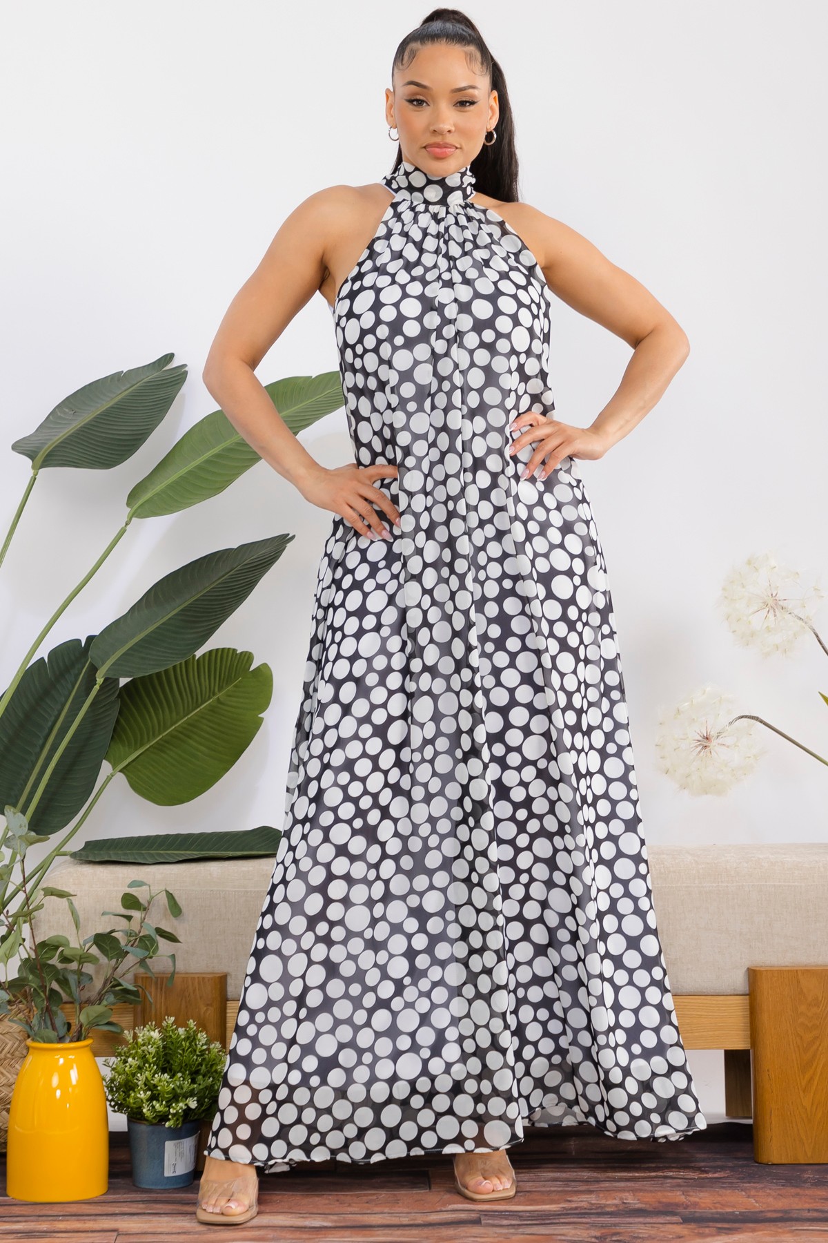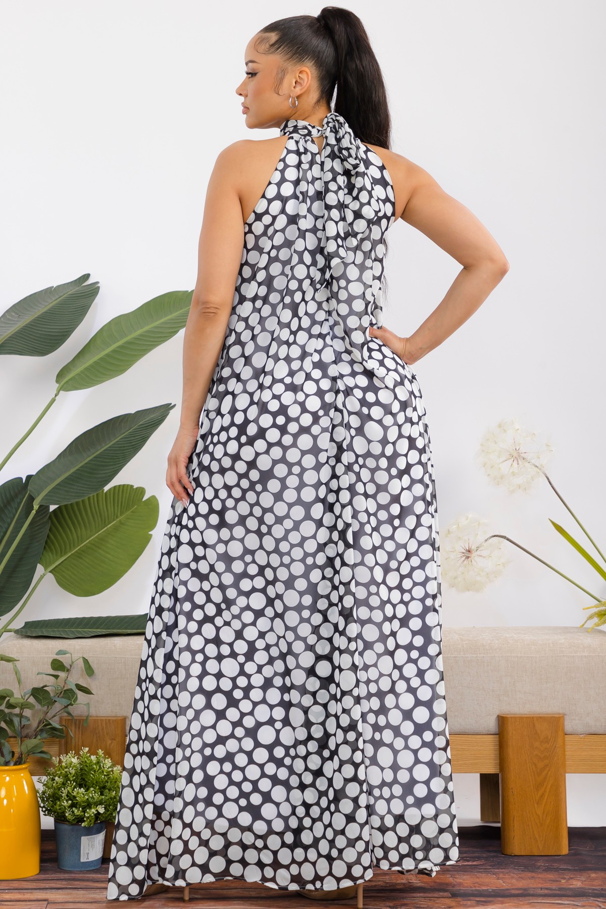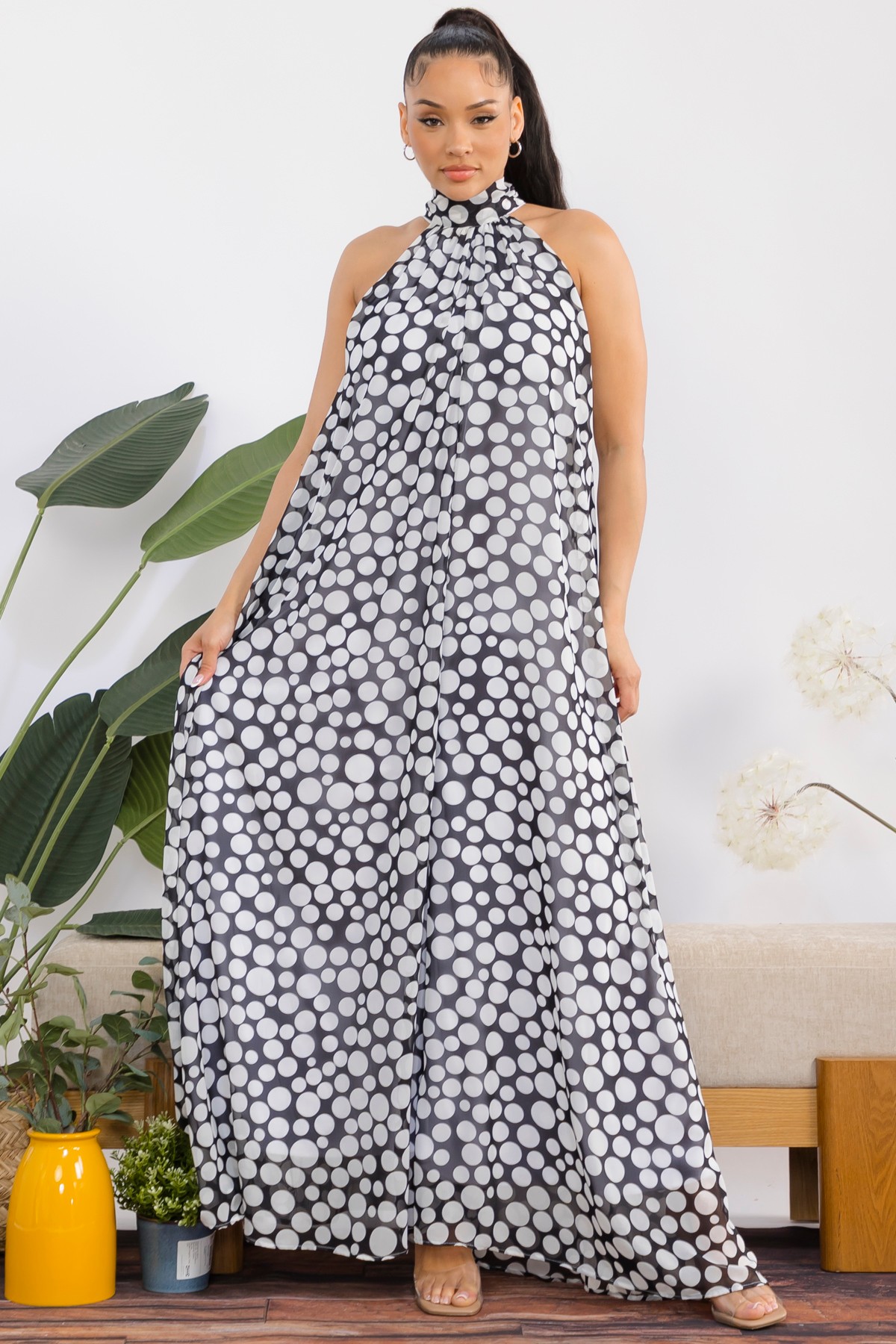 Polka dots Jumpsuit embodies effortless elegance and chic sophistication. Designed with a flattering halter neckline that artfully ties into a beautiful bow, this sleeveless silhouette drapes gracefully to the floor, creating a mesmerizing flow with every movement. *** New Style *** sleeveless halter neck wide leg chiffon jumpsuit with back tie