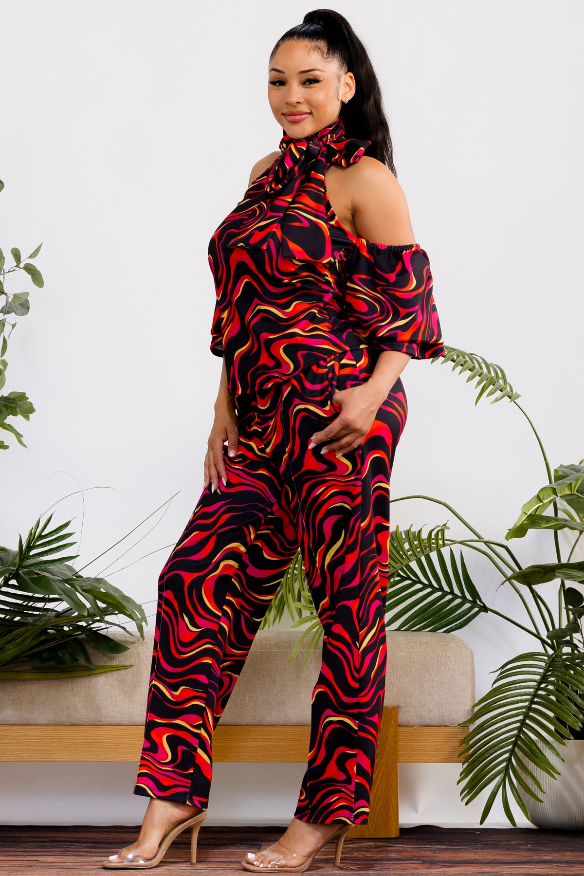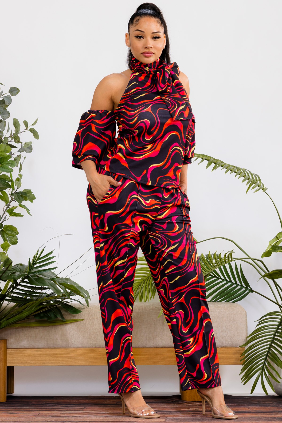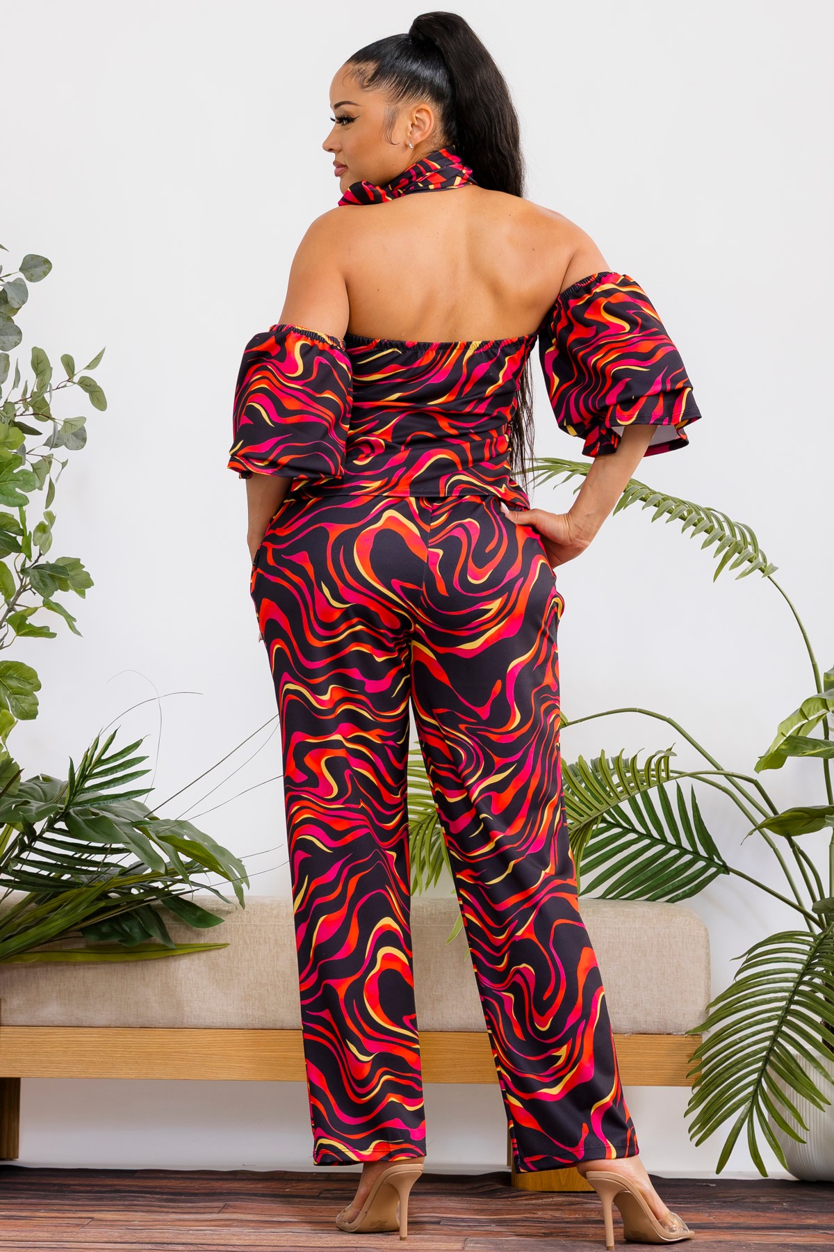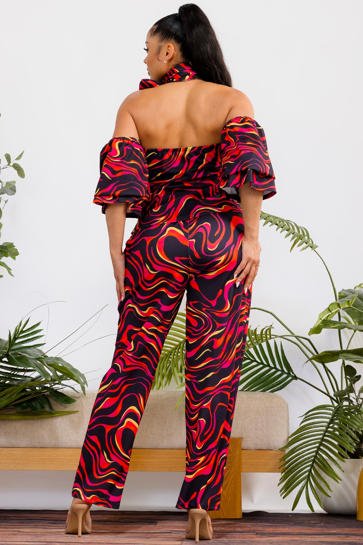 Multi color, two-piece set, The top features a chic cold-shoulder design with elegant puff sleeves and a sophisticated mock neck, offering a blend of contemporary style and feminine allure. Complementing the top are the comfortable wide-leg pants, designed with a flattering high waist and an elastic waistband for a perfect fit and all-day comfort. This versatile set transitions seamlessly from casual outings to more dressed-up occasions. Crafted from soft, flowing fabric. Ideal for any season.