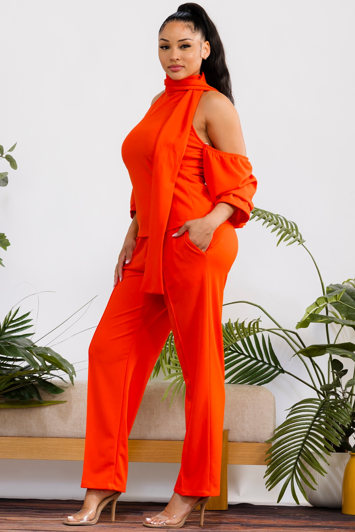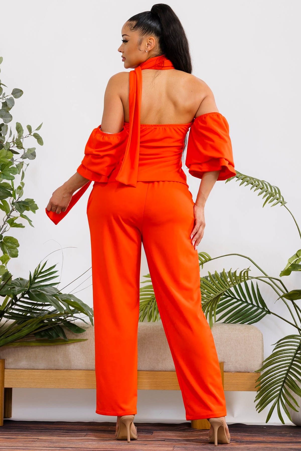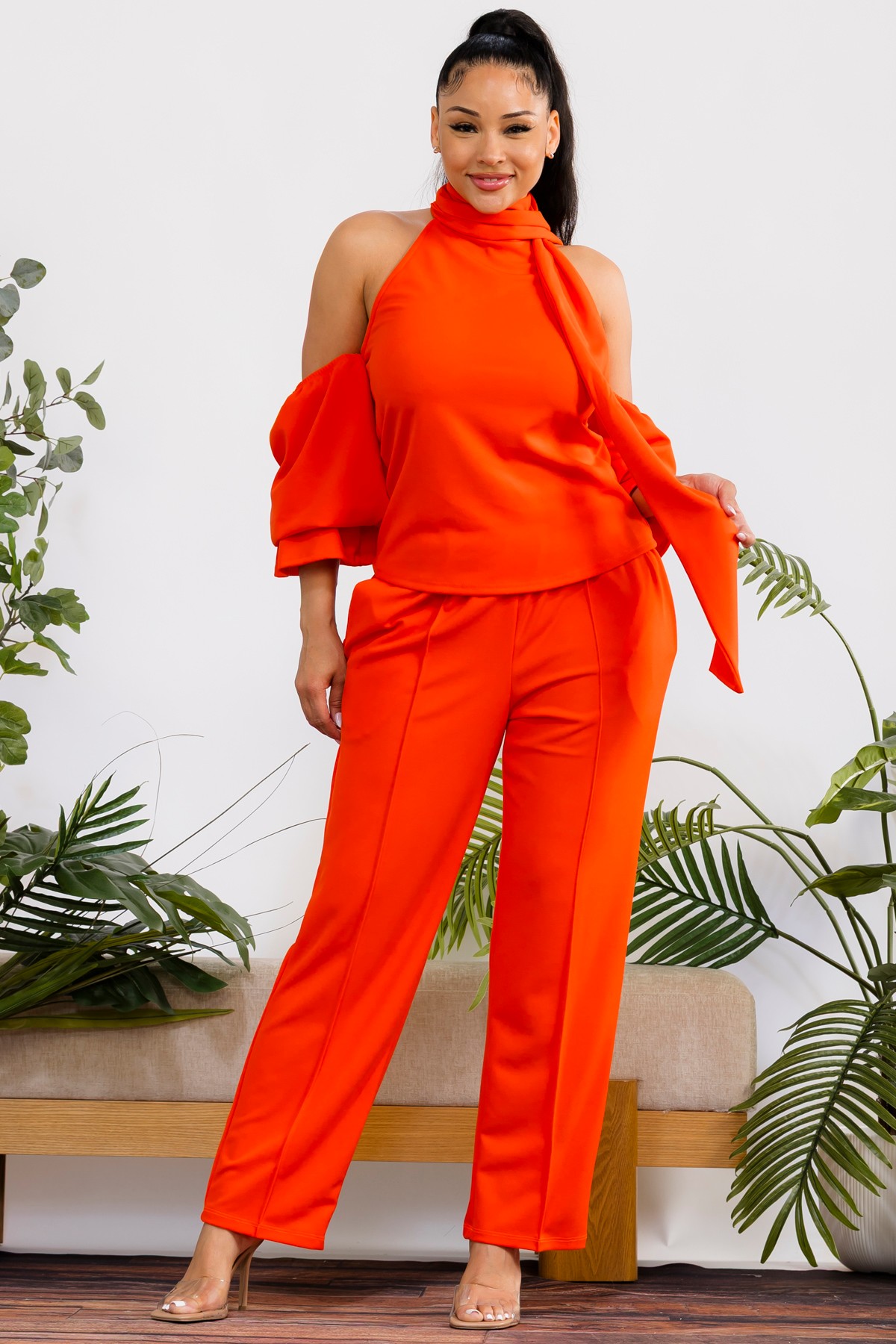 Solid two-piece set, The top features a chic cold-shoulder design with elegant puff sleeves and a sophisticated mock neck, offering a blend of contemporary style and feminine allure. Complementing the top are the comfortable wide-leg pants, designed with a flattering high waist and an elastic waistband for a perfect fit and all-day comfort. This versatile set transitions seamlessly from casual outings to more dressed-up occasions. Crafted from soft, flowing fabric. Ideal for any season.
