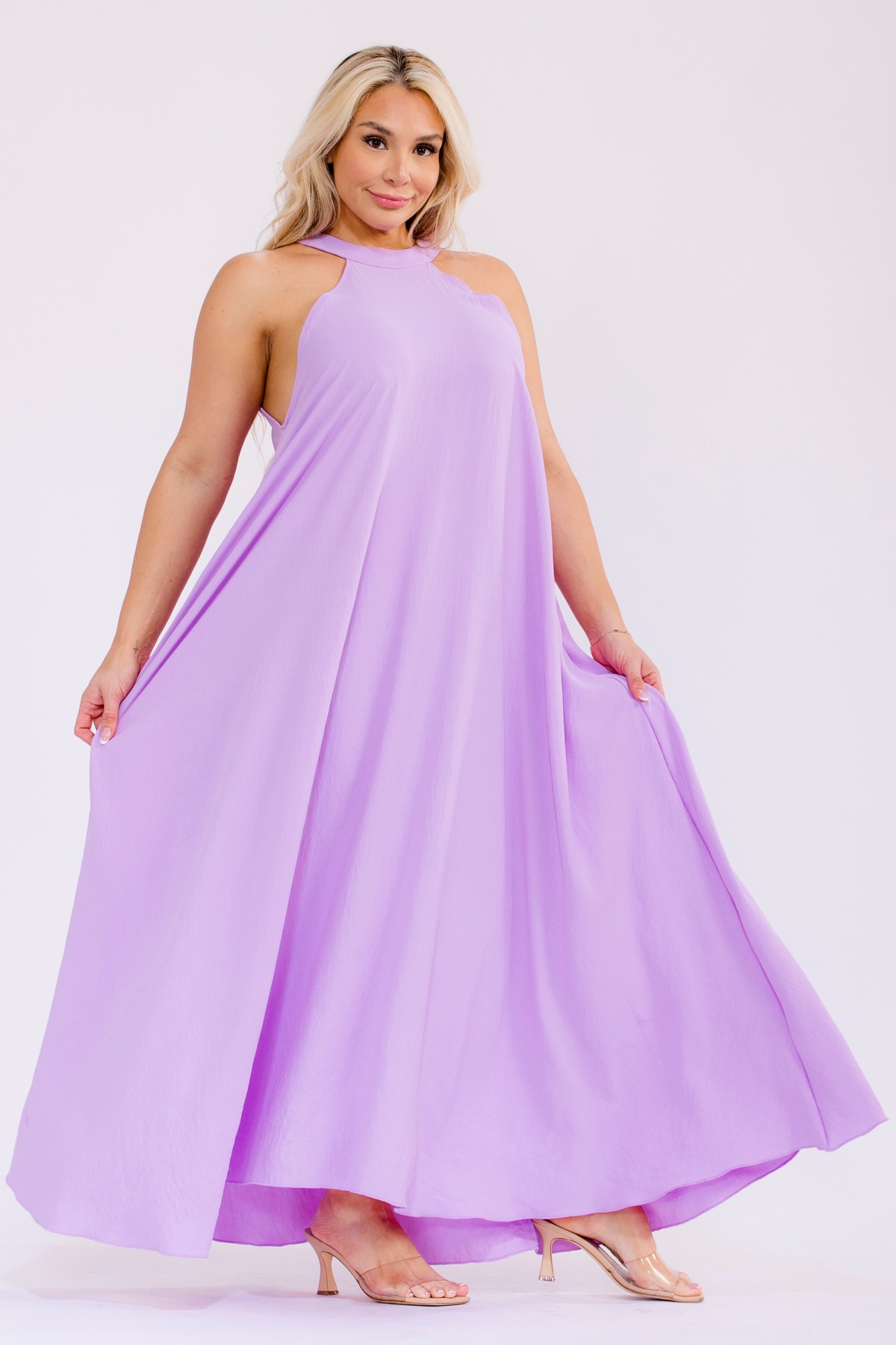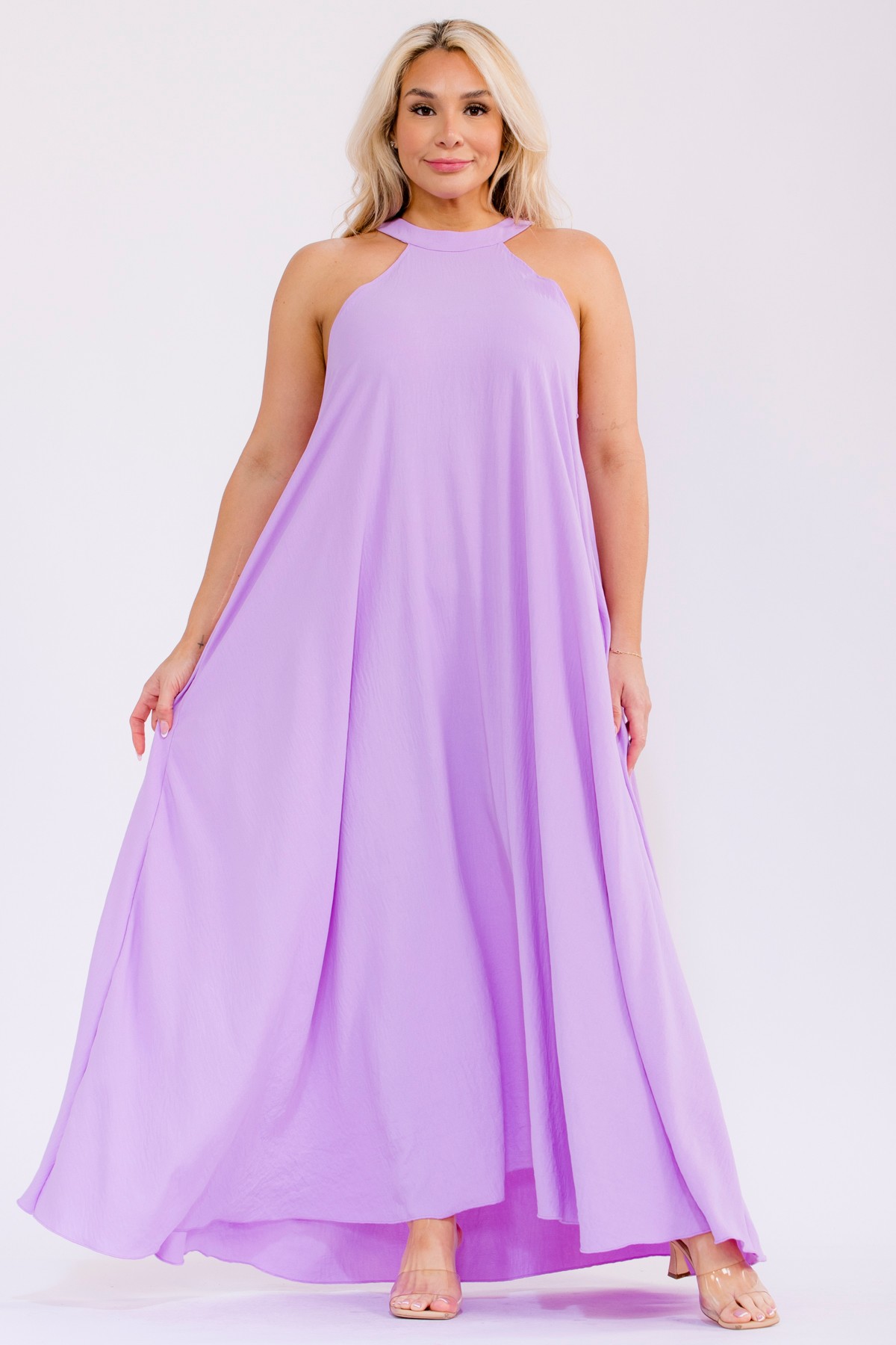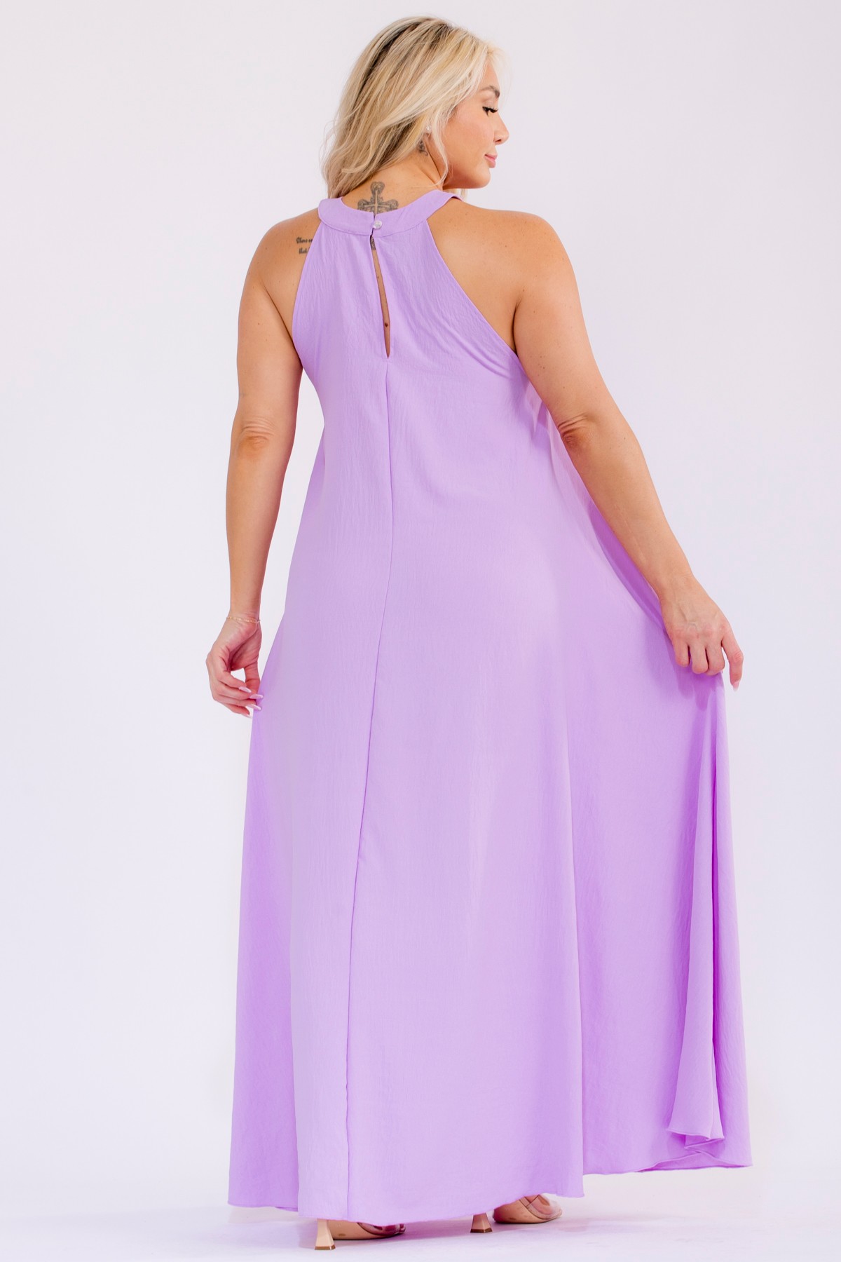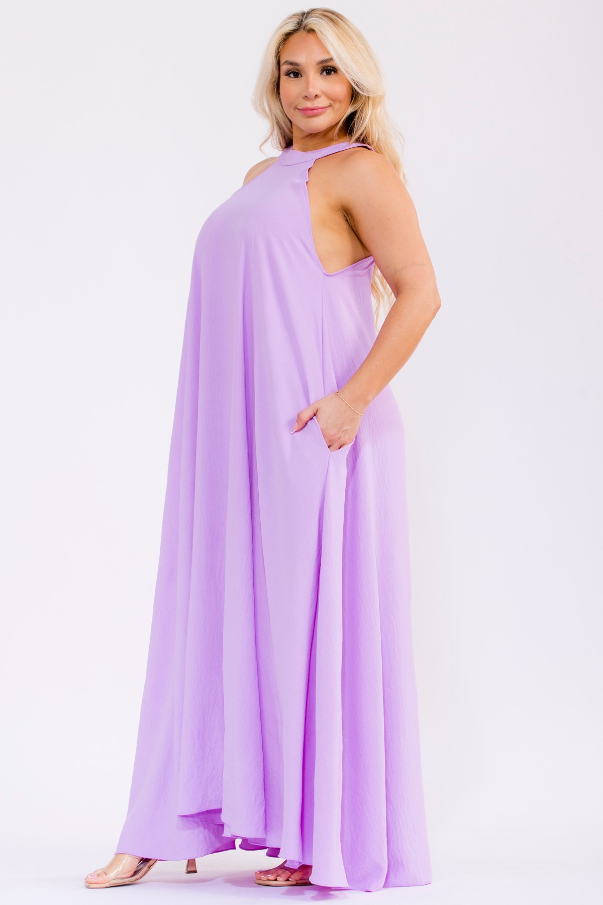 Embrace sunny days and effortless style with this vibrant maxi dress. This sleeveless halter neck dress boasts a beautifully flowy silhouette that drapes gracefully to the floor. Its casual yet chic design makes it perfect for a variety of occasions, from a relaxed summer day out to a beachside vacation or a festive party. The lightweight fabric ensures maximum comfort, while the wide-leg cut adds a touch of bohemian flair. Practical side pockets offer convenience, blending fashion with function.